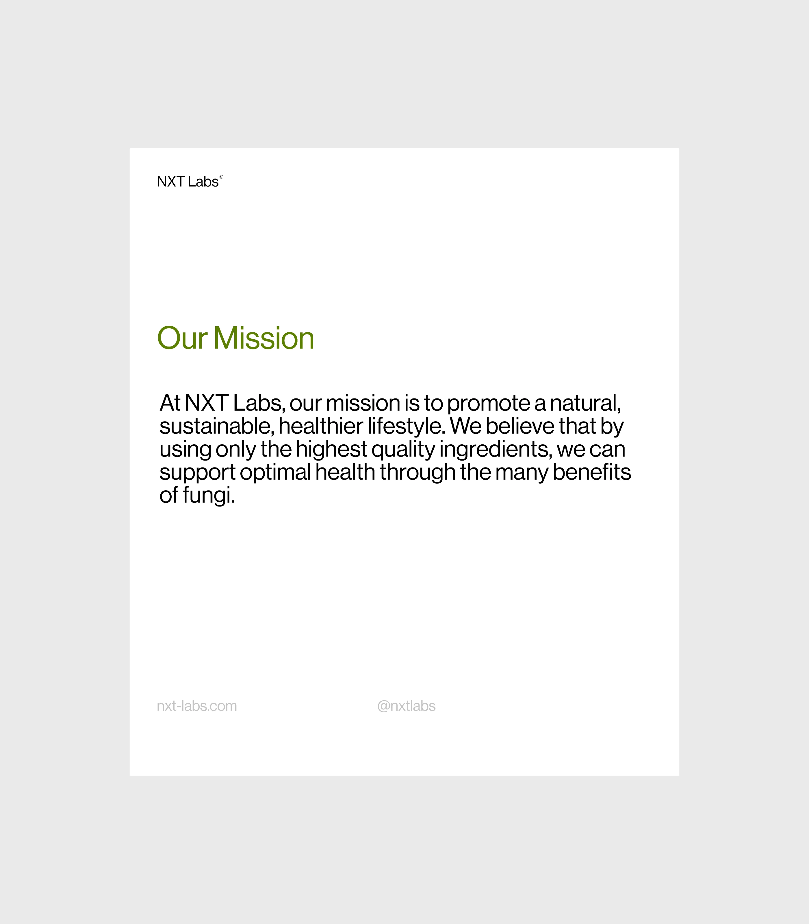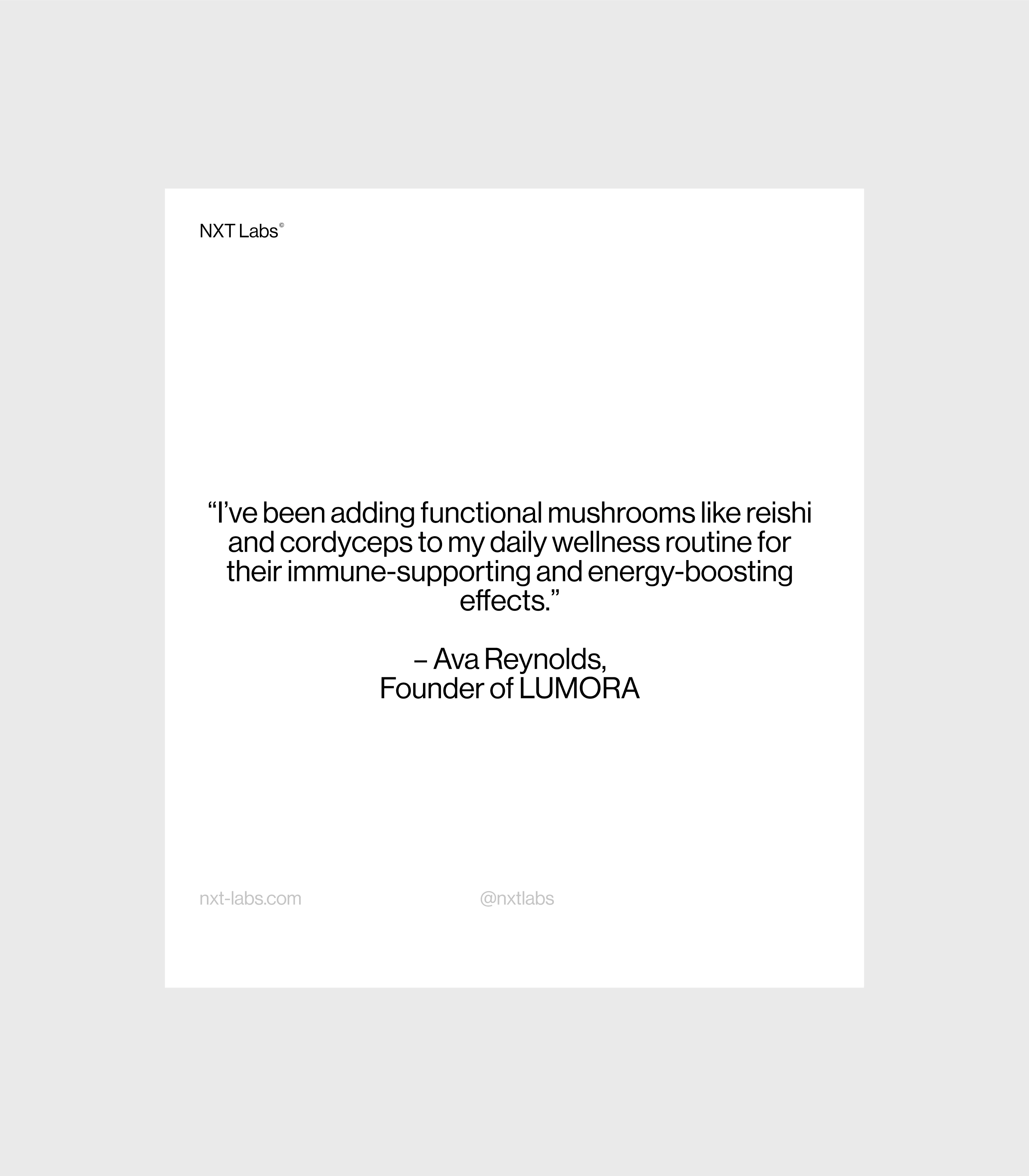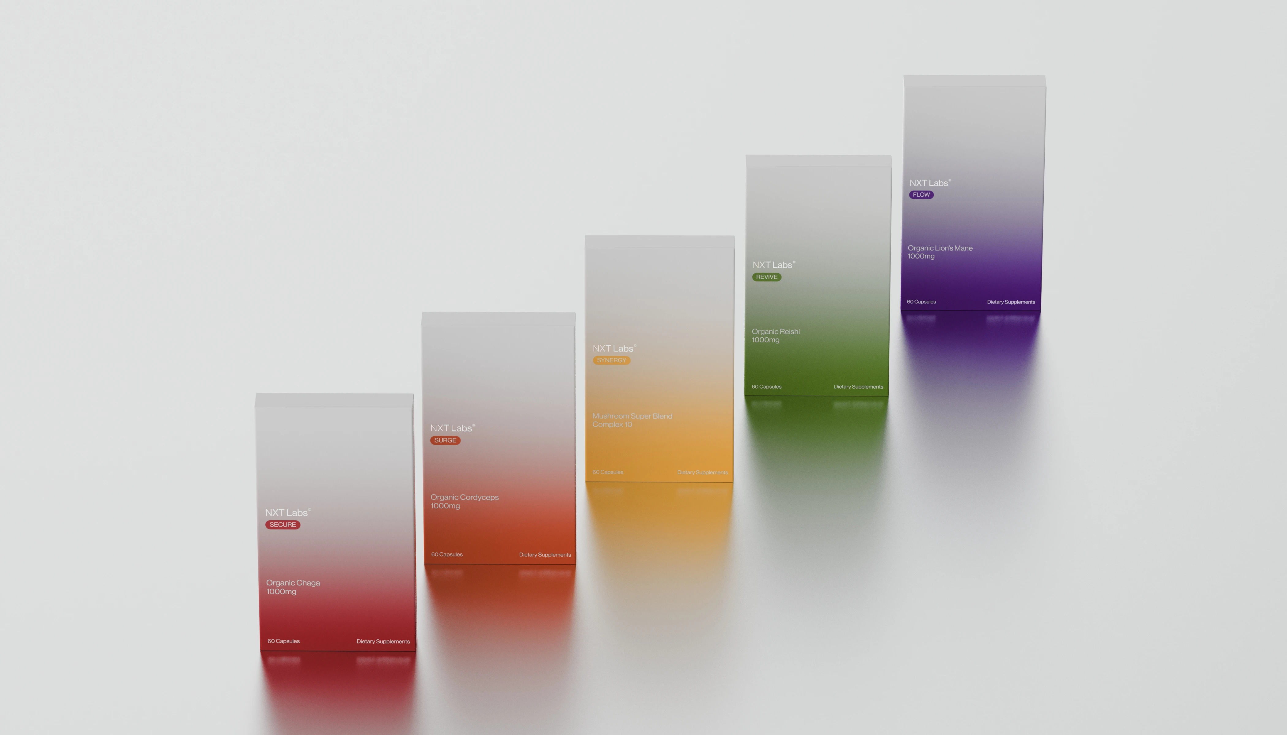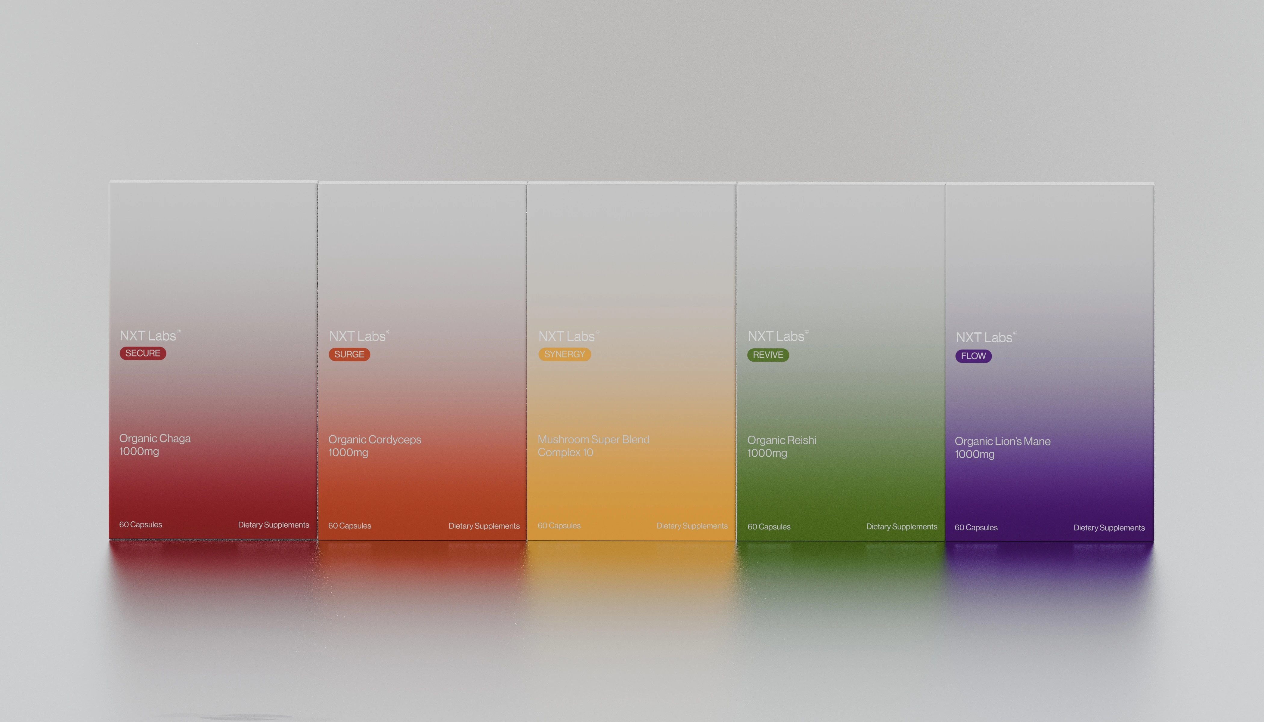 NXT Labs reengineers complex fungal biology into an intuitive daily protocol. We’ve developed a precise, color-coded spectrum of supplements designed to hit key performance markers: Organic Cordyceps for sustained energy, Lion’s Mane for cognitive clarity, and Reishi for stress resilience, etc. Shedding the rustic tropes of the industry, our packaging adopts a clinical, gradient-driven visual language. We position the mushroom not merely as an ingredient, but as a high-performance tool for a sustainable, optimized existence.